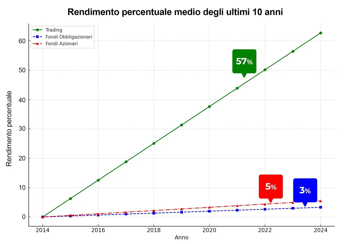 Con il trading, invece, con il giusto impegno puoi ambire a rendimenti persino superiori al 50% annuo, anche partendo con capitali più piccoli. (E se hai un portafoglio diversificato, ancora meglio.)